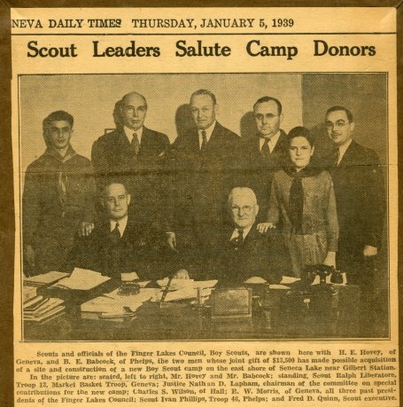 Mr. Babcock was a well-known civic leader, in the Ontario area, who believed in giving back to the community some of the blessings bestowed upon him. Besides our Boy Scout Camp, Mr. Babcock donated a women’s dormitory to Wooster College in 1936 that was named Babcock Hall, was a regular generous donor to the Phelps Presbyterian Church, the Geneva Girl Scout council, the Community Chest and Clifton Springs Hospital (Sanitarium). Mr. Babcock also served as chairman of the board at Clifton Springs Sanitarium. Mr. babcock was an elder of his church as well as a trustee at Wooster College. Mr. Babcock once stated that after a careful and thoughtful survey, he believes that the Scout movement offers to American youth the most vital training in the principles of democracy and religious tolerance.