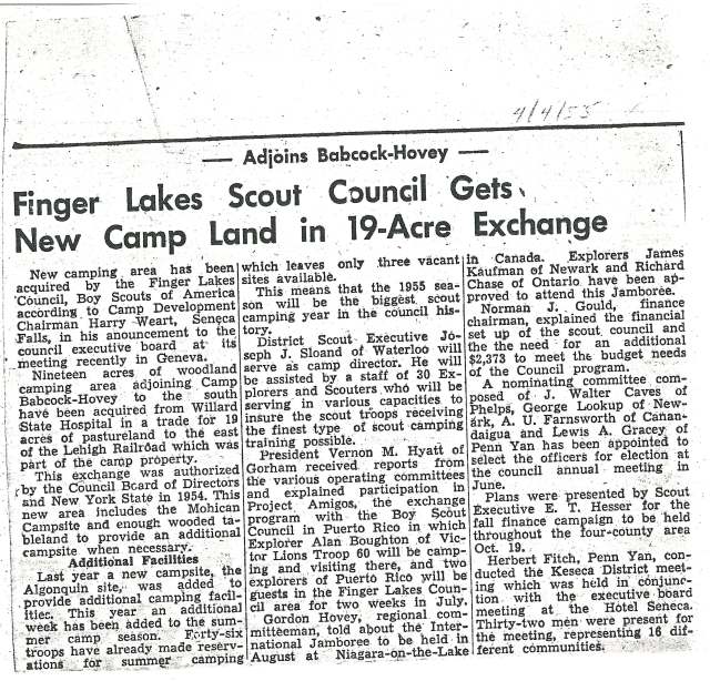 April 4, 1955 – New camping area was acquired by the Finger Lakes Council, BSA according to Camp Development Chairman Harry Weart, Seneca Falls, in his announcement to the council executive board at its meeting recently in Geneva.