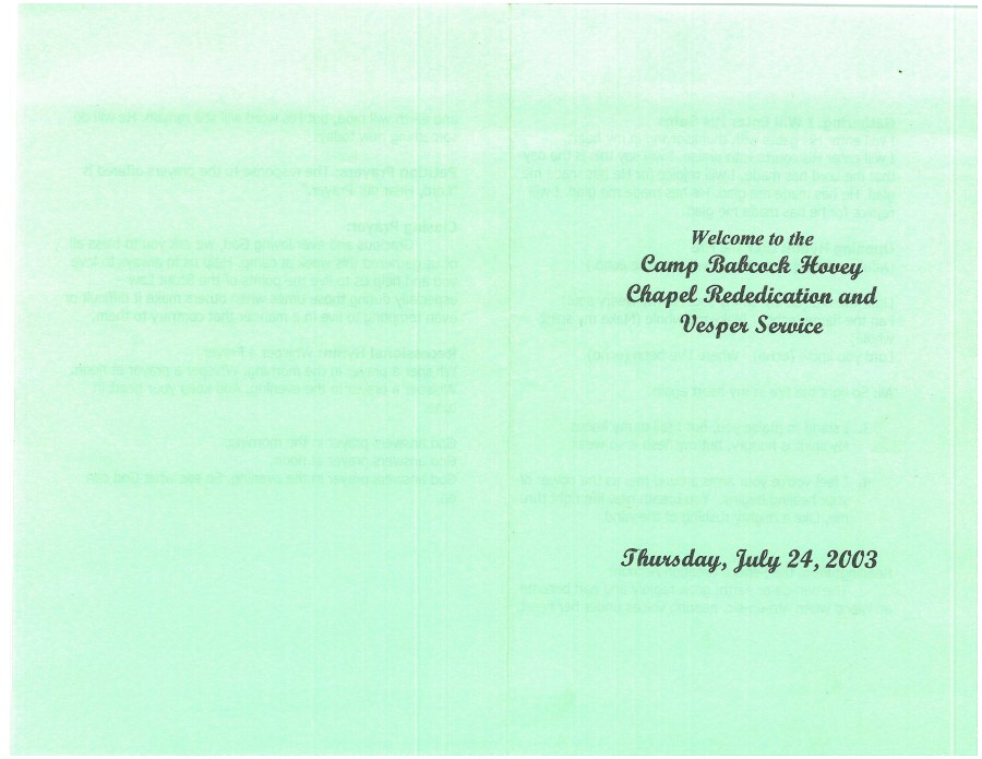 Program for the 2003 Camp Babcock Hovey Chapel Renovations. Camp Babcock-Hovey is the Premier Boy Scout Camp in the Finger Lakes Region of New York